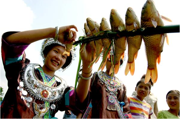 燒魚是廣西融水苗胞的習俗之一,融水的苗族同胞素有在稻田里養(yǎng)魚的習慣,每年春插,苗家人向來喜歡在稻田里放養(yǎng)鯉魚。每年的秋收稻黃時節(jié)也是田鯉肥壯之時,這時來自四鄉(xiāng)八寨眾多的各民族兄弟便匯聚起來,點燃一堆堆篝火,燒田鯉吃野餐,盡享豐收喜悅。燒魚從9月稻黃收割開始持續(xù)到12月底才正式結(jié)束,故名“元寶山金秋燒魚季”。燒魚季節(jié),苗寨家家戶戶釀起醇濃的甜酒,蒸著香噴噴的糯米飯,帶上食鹽、辣椒、蒜苗、蔥花、薄荷等佐料上山去剪禾。晌午時候,他們在田頭或田邊的平地燒起一堆堆篝火,從田里抓來一籠籠活蹦亂跳的鯉魚,用樹枝或竹片把魚一條條串起,排成一排,然后放在紅彤彤的火炭上翻來覆去地烤,大約半小時左右,魚被烤炙得“呲呲”作響,水分烤干,慢慢地變黃,直至熟透,香飄四溢,遠遠就可聞到香味。