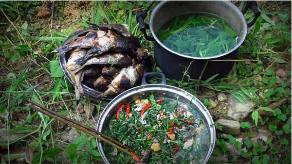 打魚湯也獨具特點,先用缽頭盛好冷水,放入佐料和魚仔,再把洗凈的鵝卵石放進火炭中燒的通紅,然后放進缽里,反復多次,直至把魚湯燒開,魚仔和佐料燒熟,味道特別新鮮可口。