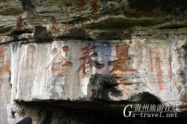 “是春谷”摩崖長20米,高3米,約2萬余字,名為《洗心泉集》,從經(jīng)史集成的詩章共46首,670佘行。所集之書包括易、書、詩、春秋、三禮、四書、孝經(jīng)、爾雅、楚辭、漢、魏、晉、劉宋、南齊、北、周、隋、唐、五代、宋、金、遼、元、明以及時賢黔宦,黔人等各時代著名書籍。每字約4,5厘米見方,歐體楷書工整秀麗,為貴州摩崖上乘之作。“白苧春流環(huán)谷水,青山高詠屬宣城?!庇紊酵嫠g,詠此詩句,別有韻味。