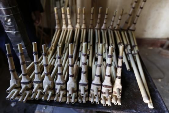 制作:蘆笙管用當?shù)胤Q蘆笙竹的竹子制作而成,管的兩端直通(有的地區(qū)蘆笙是上通下不通),按孔為方形(有的地區(qū)為圓形),簧片制作與其他地區(qū)蘆笙一樣;共六組合,用花果樹皮作兩道箍。