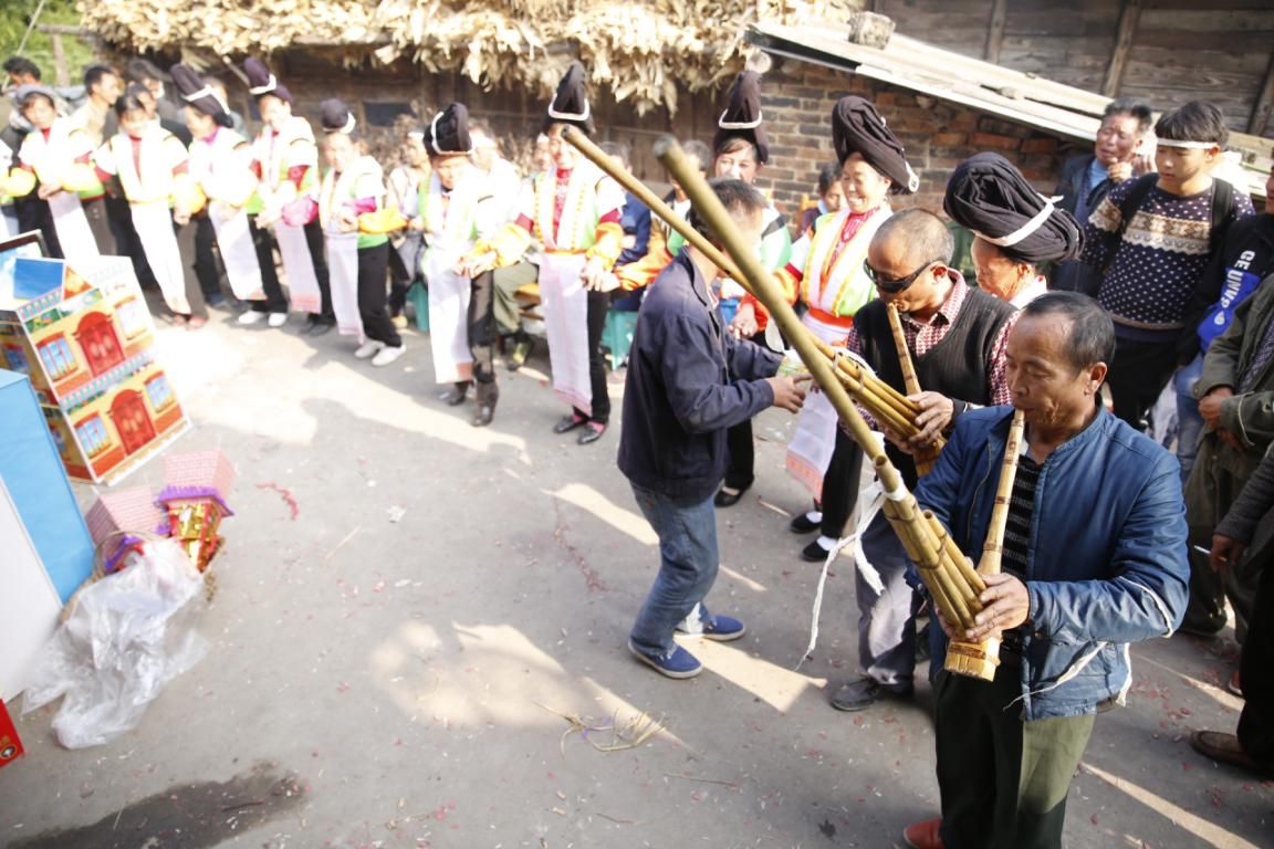 蘆笙詞曲:高坡的蘆笙詞主要以口述詞代代傳承,蘆笙詞(曲)分為“懷念曲(僅一曲)”、“喜曲”、“吊喪曲(僅一曲)”,據(jù)王永貴老師介紹原來三百六十天每天有一曲,到現(xiàn)在僅傳承七十二曲或最多一百二十曲。在吹奏和舞步方面內(nèi)容相同,但技巧方面各個村寨略有差異。在曲的排列上“懷念曲”為第一曲,吹奏第一曲時必須站著吹,每開始吹,必須先吹第一曲,否則會被人取笑不懂規(guī)矩。從這點看來,“懷念曲”有很強的民族認同感和地域特殊性。高坡蘆笙以苗語腔調(diào)為主旋律,不懂苗語腔調(diào)的人無法自然跟隨蘆笙的曲調(diào)起舞。“吊喪曲”必須在喪事活動才能吹,它的舞姿比較特別,以跪拜亡者的姿態(tài)為主。