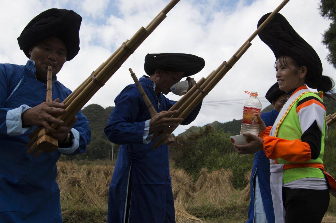 就這樣年復(fù)一年的干活,后來因為大家年齡大了,干活賣力糧食也豐收了。大哥就想,現(xiàn)在能吃飽了,要讓大家有個玩的地方和玩的工具。想去想來,他用家里面的葫蘆,把笙管插進(jìn)去,一吹又是有一種味道。所以大哥就把竹管插進(jìn)葫蘆里面,把聲音通過仔細(xì)調(diào)音制出了蘆笙,六個聲音當(dāng)時叫做六笙,后來才叫做蘆笙。